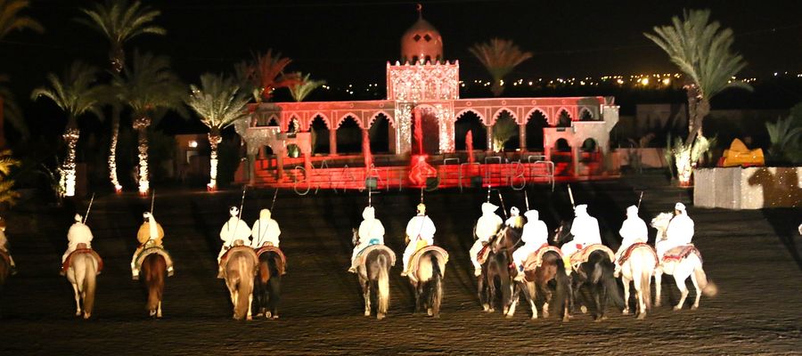 Passez une soirée inoubliable avec un spéctacle féerique et une ambiance unique, une combinaison parfaite entre plusieurs troupes folkloriques issus de toutes les régions du royaume, un reflet attractif de la richesse de la culture marocaine: des musiciens, acrobates, cavaliers et feux d'artifice...Une animation traditionnelle, magique et captivantes!